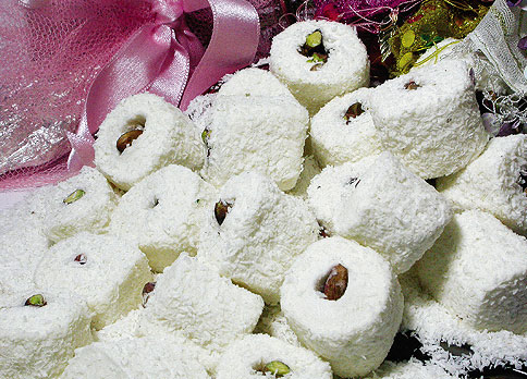 Şeker, su, nişasta, antepfıstığı, asit düzenleyici (sitrik asit), Hindistan cevizi.